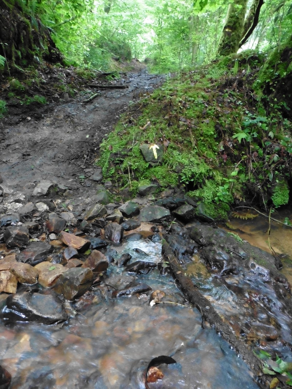 Passando sulla destra dell'hotel Canero trovo un mojon e il sentiero che sale faticosamente nel bosco, lungo il pendio di una stretta valletta.